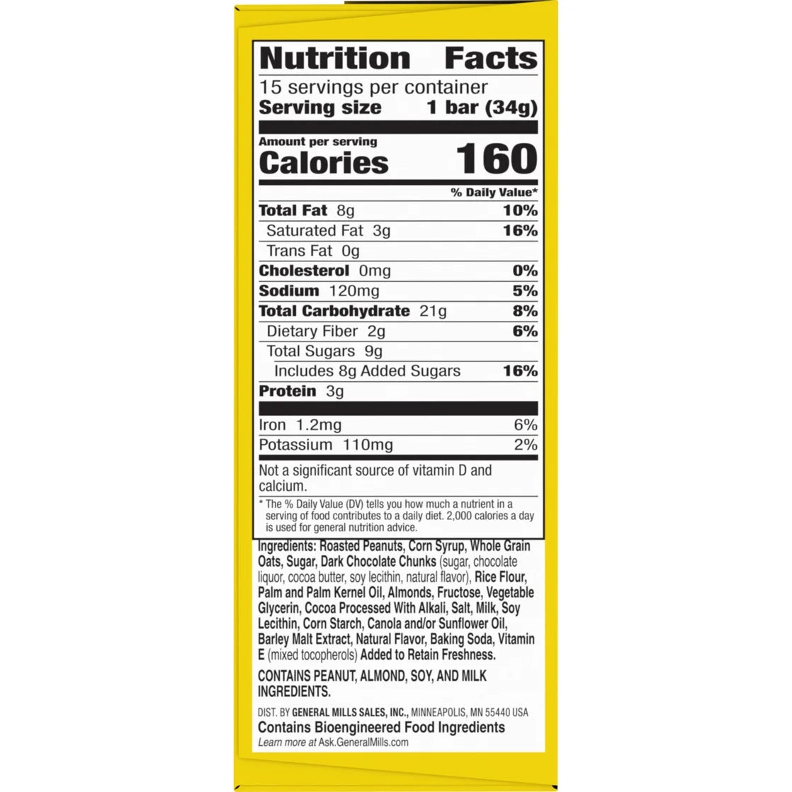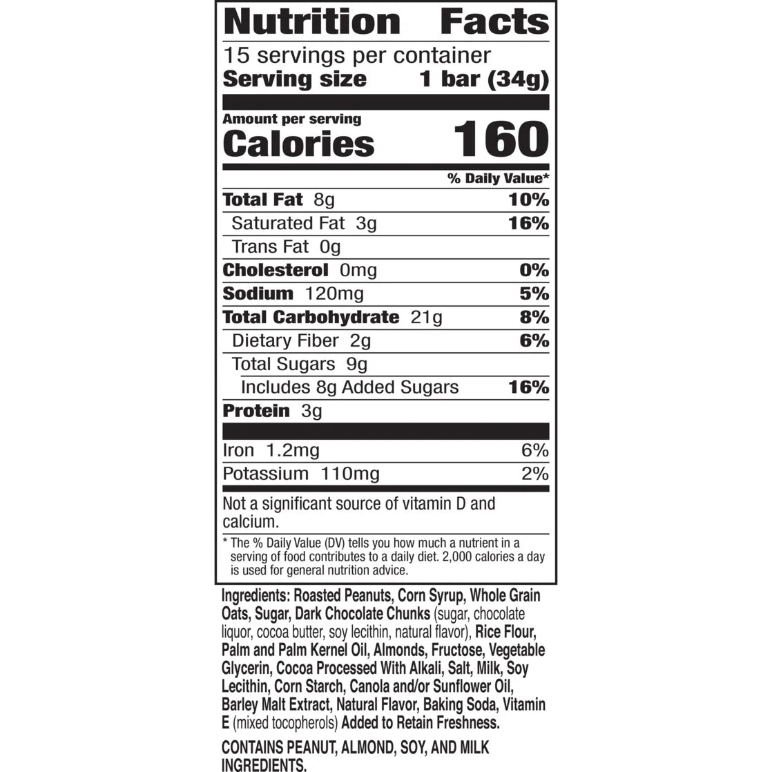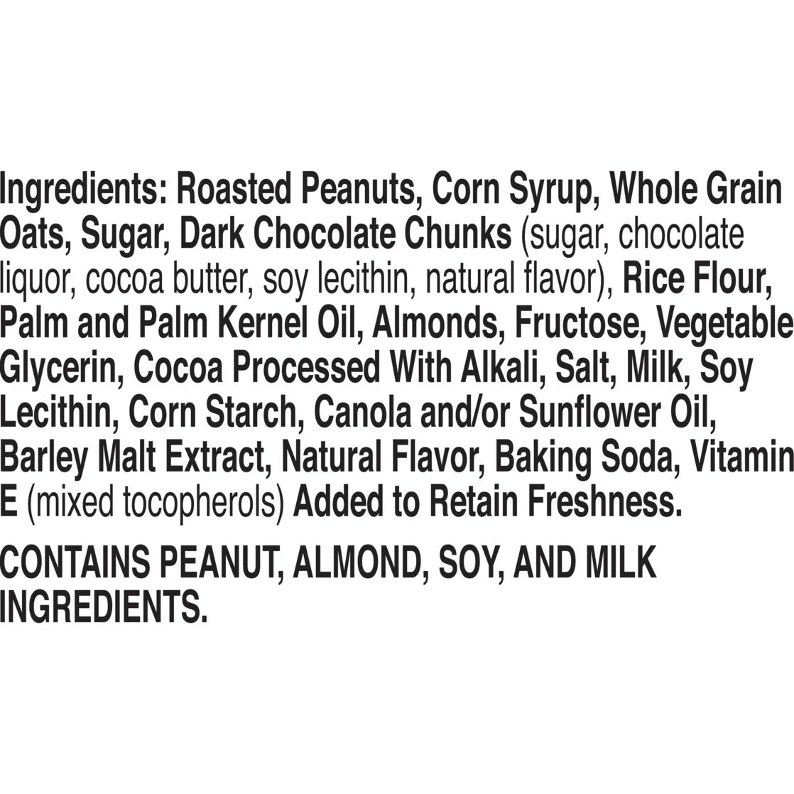 Roasted Peanuts, Corn Syrup, Whole Grain Oats, Sugar, Dark Chocolate Chunks (sugar, chocolate liquor, cocoa butter, soy lecithin, natural flavor), Rice Flour, Palm and Palm Kernel Oil, Almonds, Fructose, Vegetable Glycerin, Cocoa Processed With Alkali, Salt, Milk, Soy Lecithin, Corn Starch, Canola and/or Sunflower Oil, Barley Malt Extract, Natural Flavor, Baking Soda, Vitamin E (mixed tocopherols) Added to Retain Freshness./div>